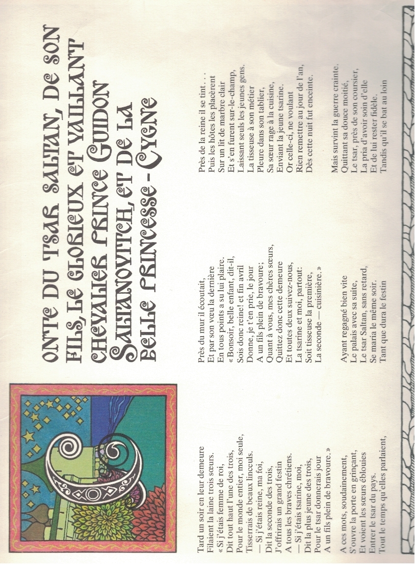 Пушкин А. Сказка о царе Салтане [= Pouchkine A. Conte du tsar Saltan, de son fils, le Glorieux et vaillant chevalier prince Guidon Saltanovich, et de la belle princess-Cygne] / Александр Пушкин. – на французском языке. – Москва : Прогресс, 1976. – 20 с.